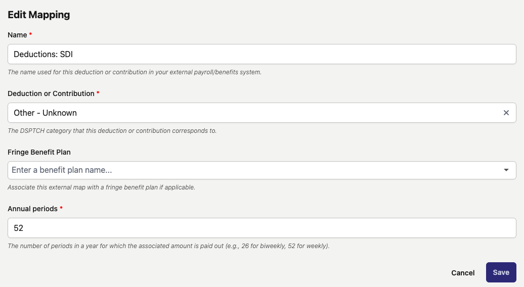 To complete the mapping, click on the "Deduction or Contribution" field and search for the field from DSPTCH that corresponds with the field from your payroll system.