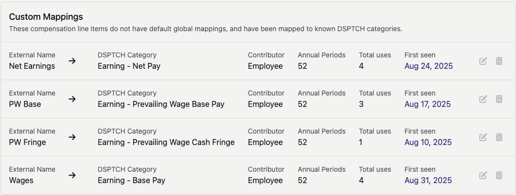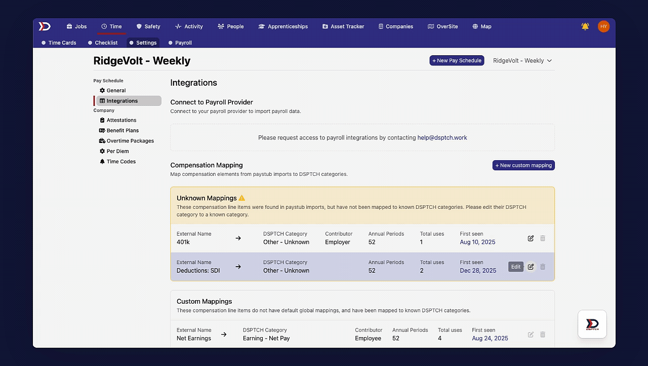 Once your payroll provider is integrated, DSPTCH attempts to automatically map all of the fields. That said, it is likely there will be a number of "Unknown Mappings" that will require manual intervention.