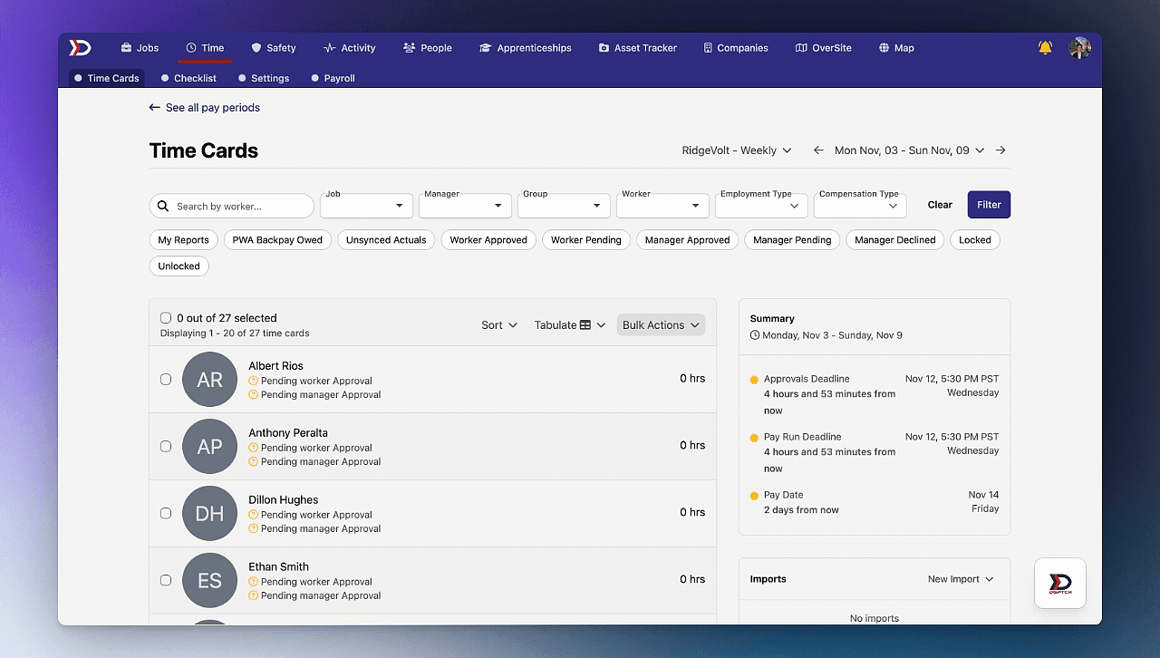To navigate to the Time Page, click the Time tab from the main navigation bar at the top of the screen. This will open a list of all Users in your Company and their Time Entries for a given Pay Period. To open a different Pay Period use the forward or back arrow at the top right of the screen.