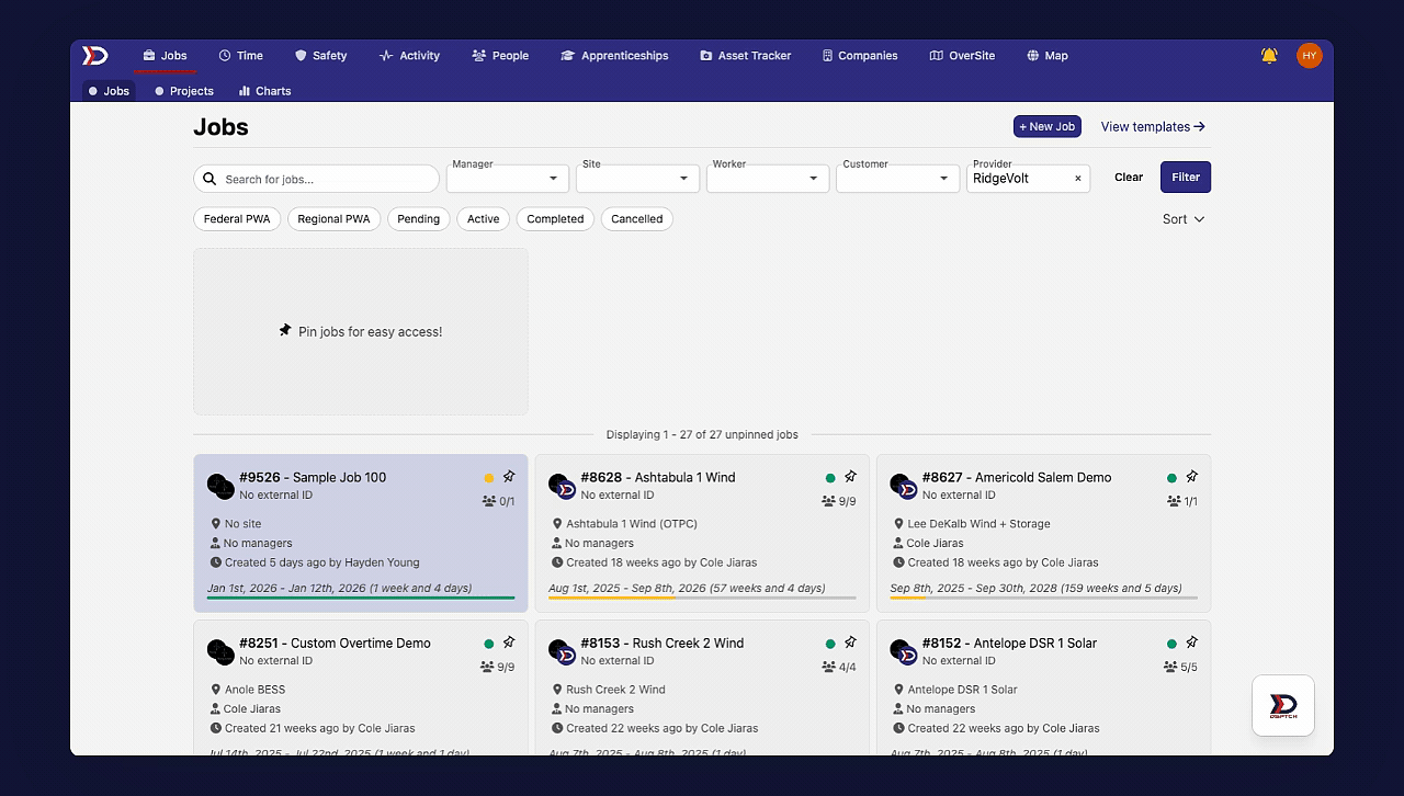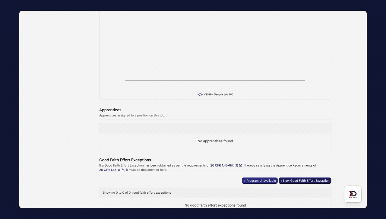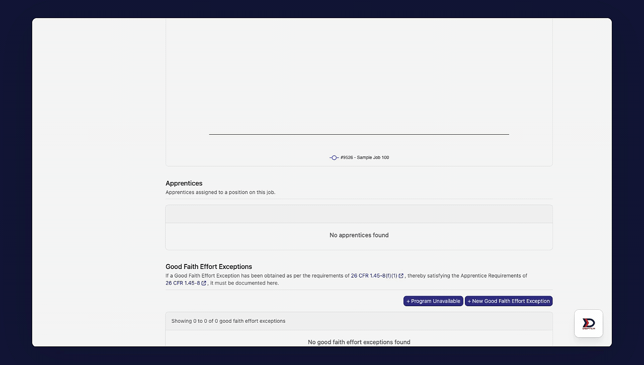 To navigate to the "Good Faith Effort Exceptions" dashboard, start by clicking on the relevant job card. Then, click the "Compliance" tab from the sub-navigation bar near the top of the page. Next, click the "Apprenticeships" tab from the menu on the left side of the page.