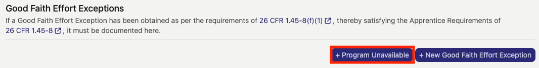 To add this type of Good Faith Exception, click the "+ Program Unavailable" button (indicated by the red box in the image below).