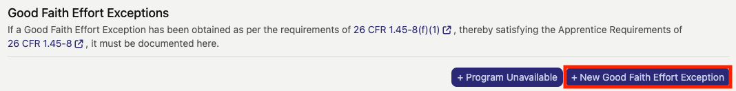 To add this type of Good Faith Exception, click the "+ New Good Faith Effort Exception" button (indicated by the red box in the image below).