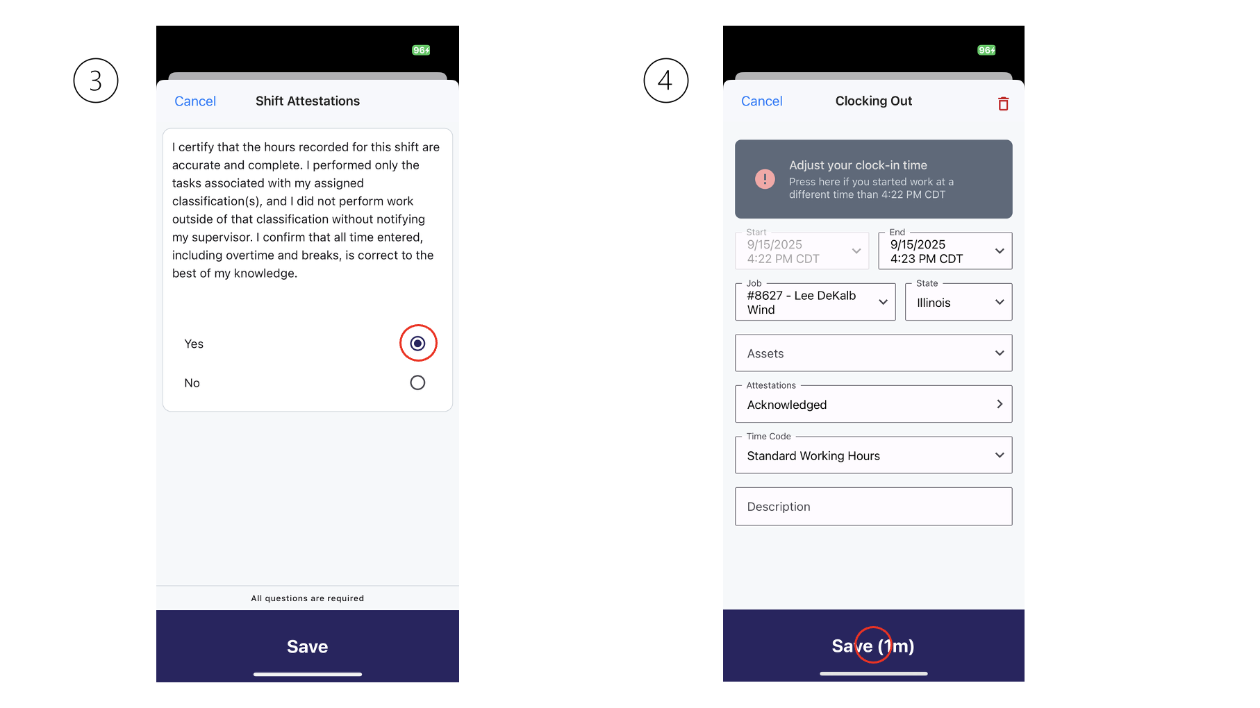 Finally, tap "Save" at the bottom of the "Clocking Out" page to record the Time Entry along with its Attestation.
