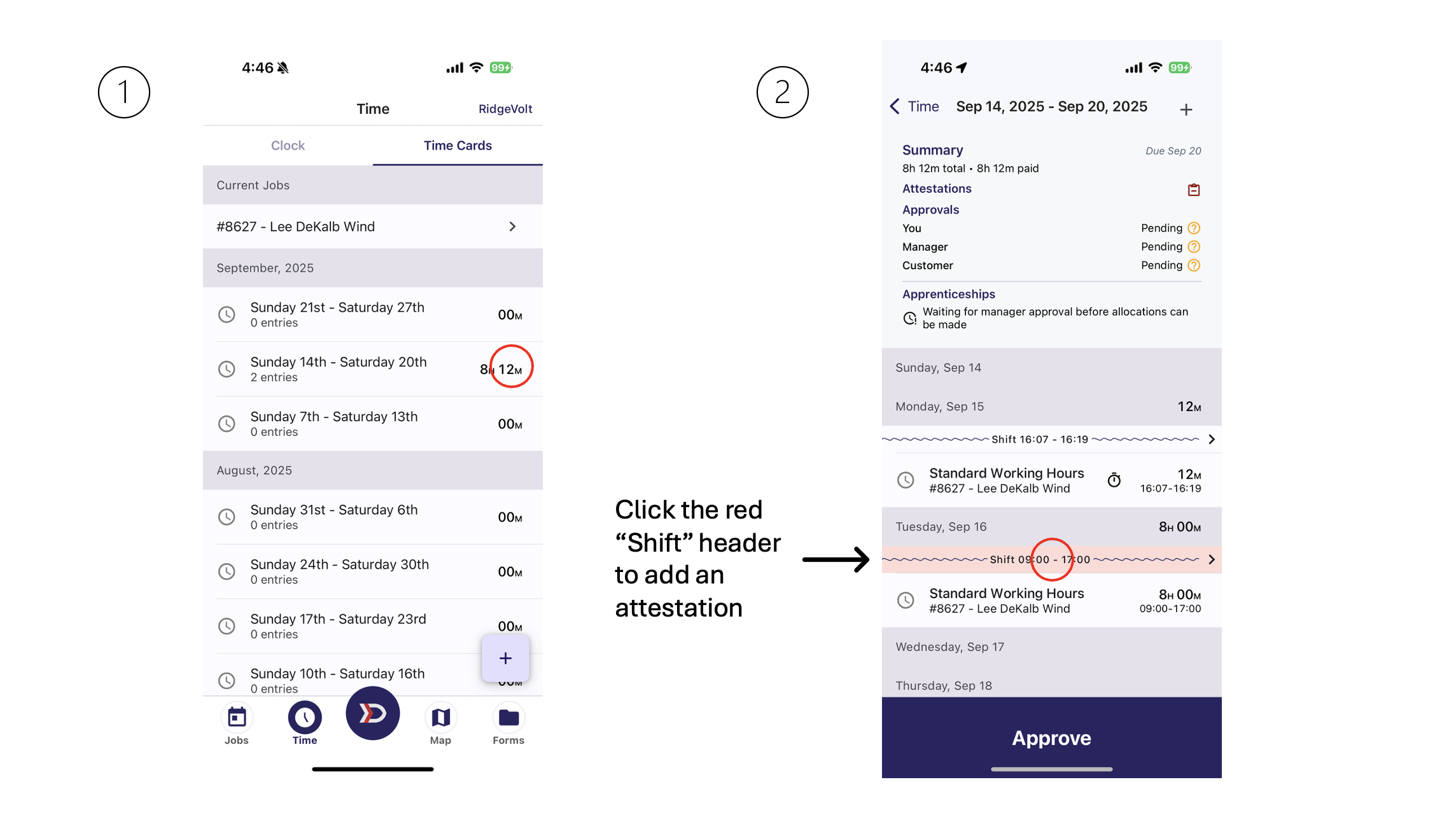 Start by tapping on a Pay Period with a Time Entry that requires an Attestation. Then, locate a Time Entry that requires an Attestation (noted by the red "Shift" banner above the Time Entry).