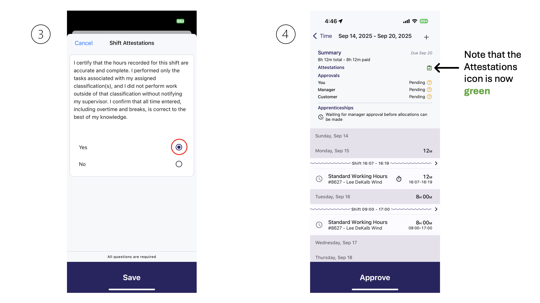Tap on the red "Shift" banner. Then, select "Yes" or "No" to respond to the Attestation Statement, and click "Save".