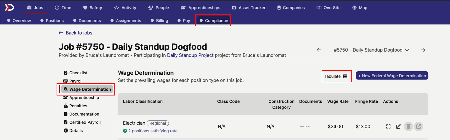 To access the LCP Tracker export, first navigate to the job you want to export data for. From there, go to the "Compliance" tab at the top, and click "Wage Determination" on the side menu. On that page there will be a "Tabulate" button next to the Create New Wage Determination button.