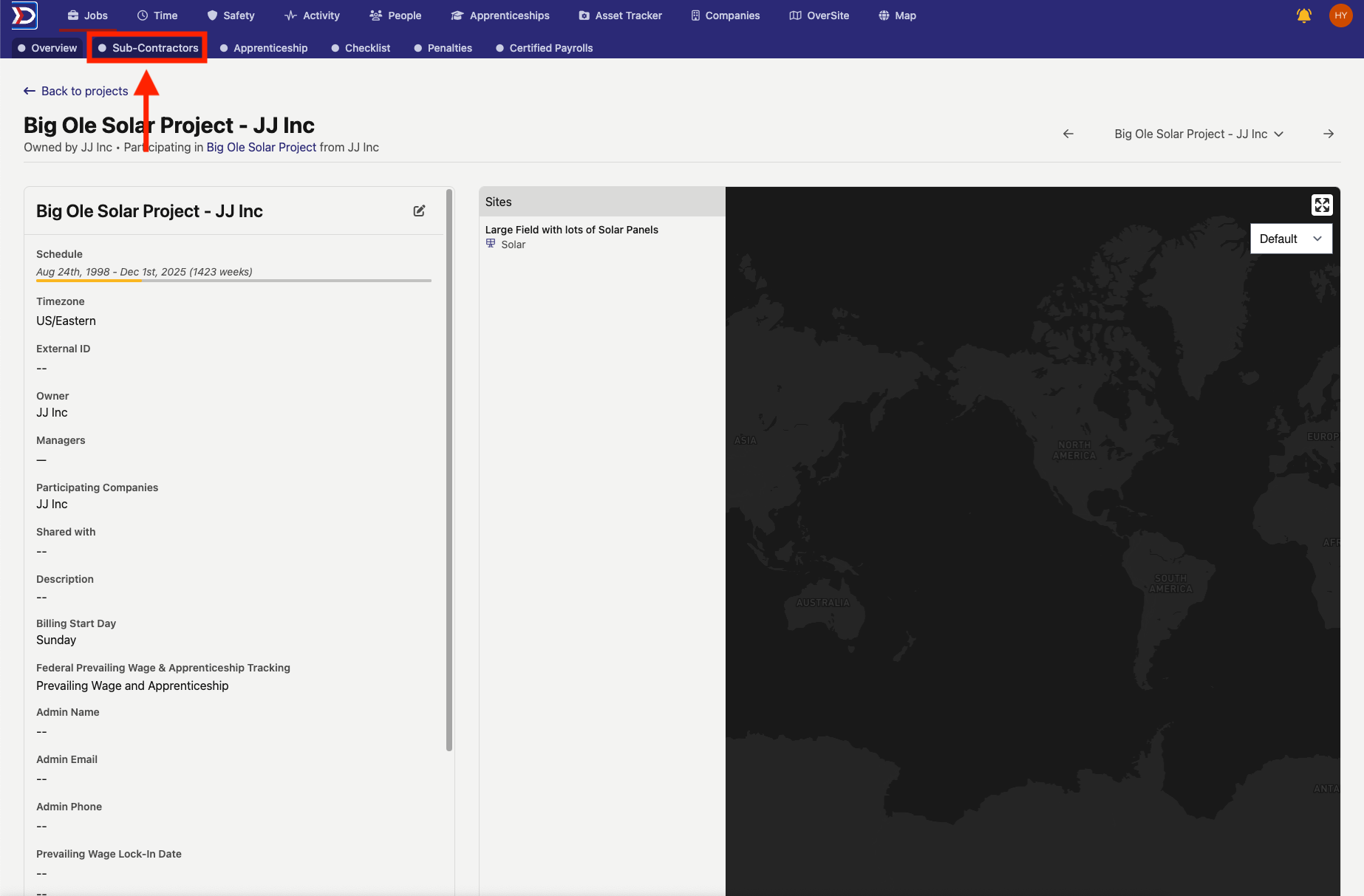 For Projects there is a Sub-Contractors Tab that provides visibility into a Project's sub-projects and jobs, as well as penalties associated with the project and its components. For more information on creating a project, please review the Create a Project Section of our Projects Help Document.