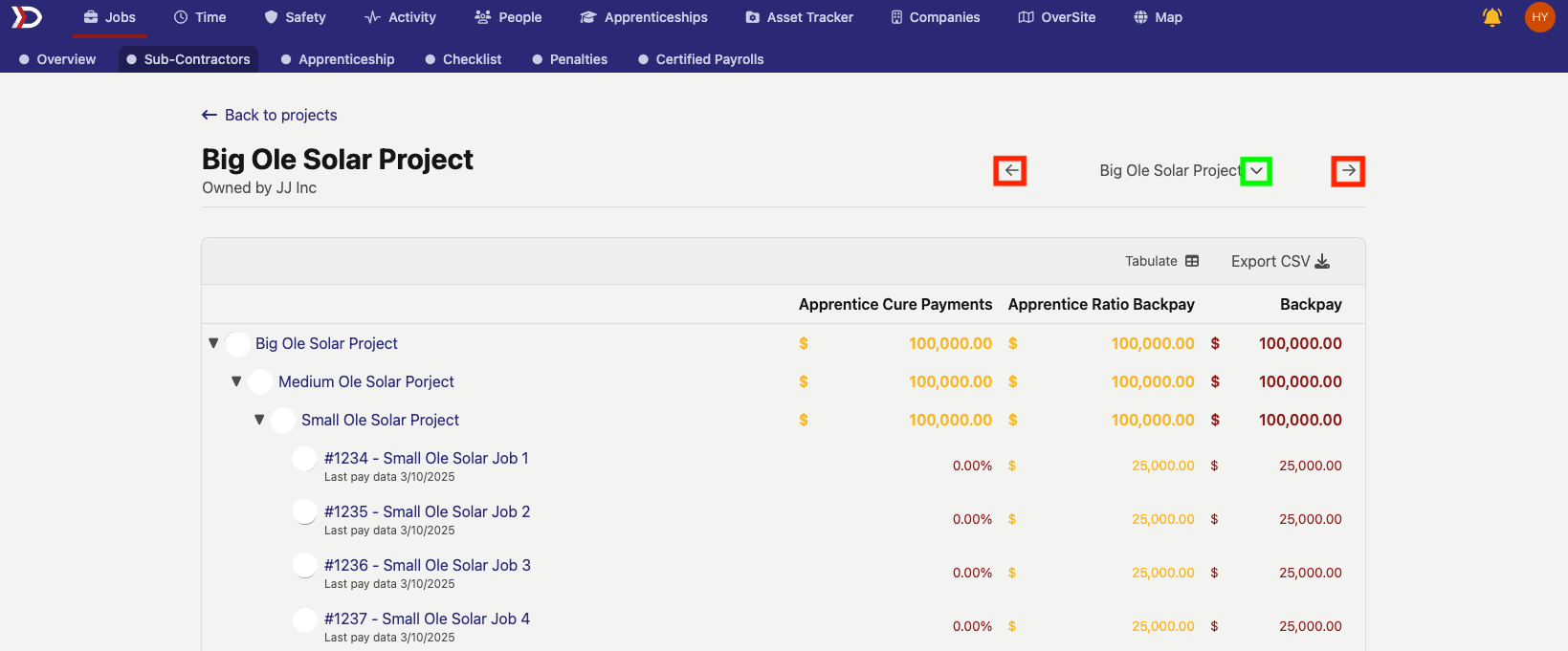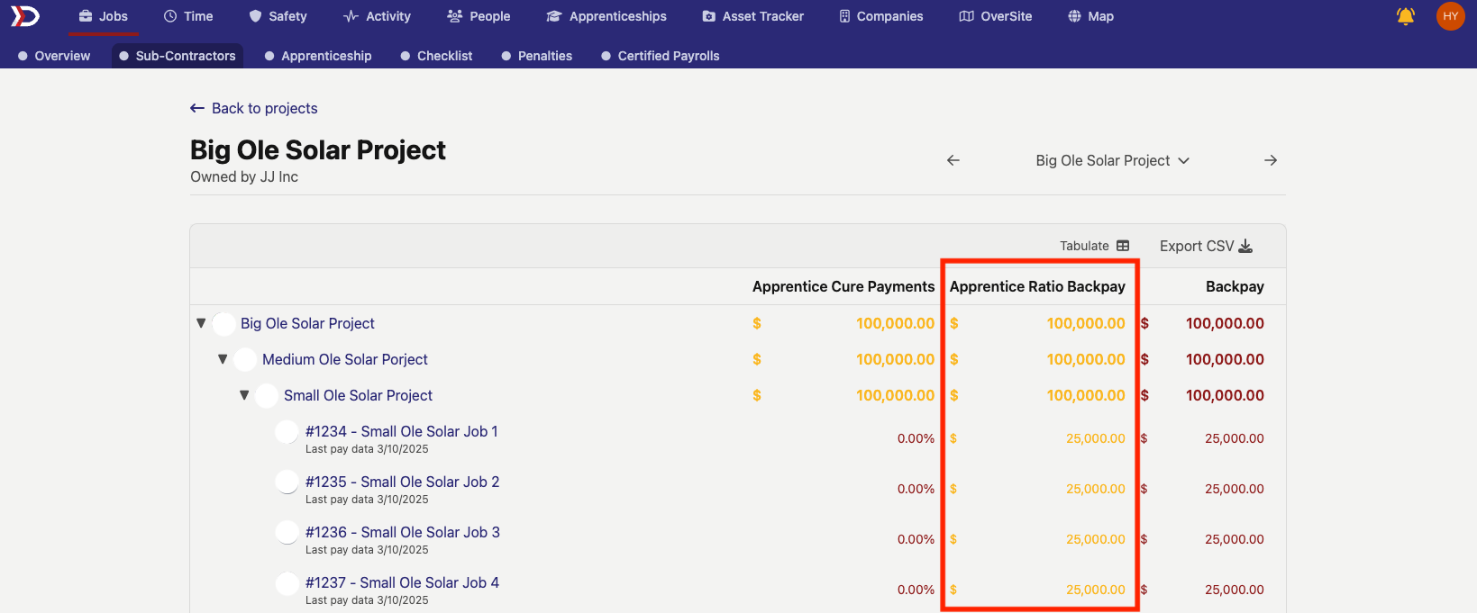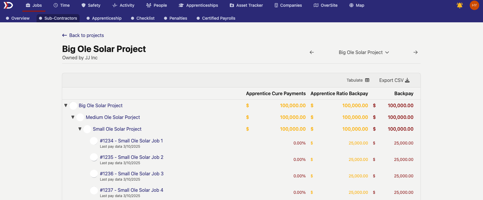 The "Sub-Contractors" tab gives an overview of all sub-projects and jobs that make up a project, as well as apprentice penalties and backpay associated with the project.