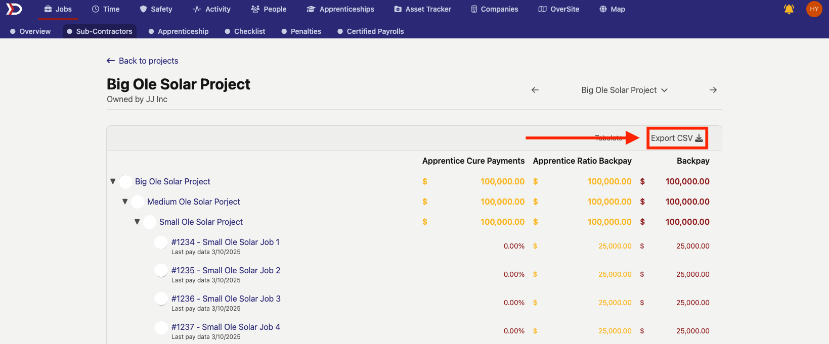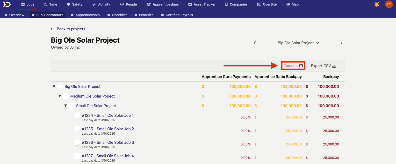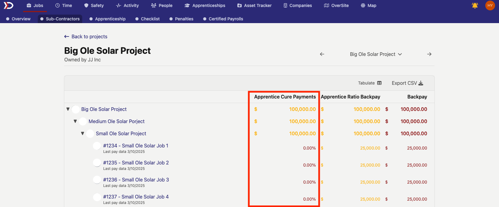 The "Sub-Contractors" tab gives an overview of all sub-projects and jobs that make up a project, as well as apprentice penalties and backpay associated with the project.