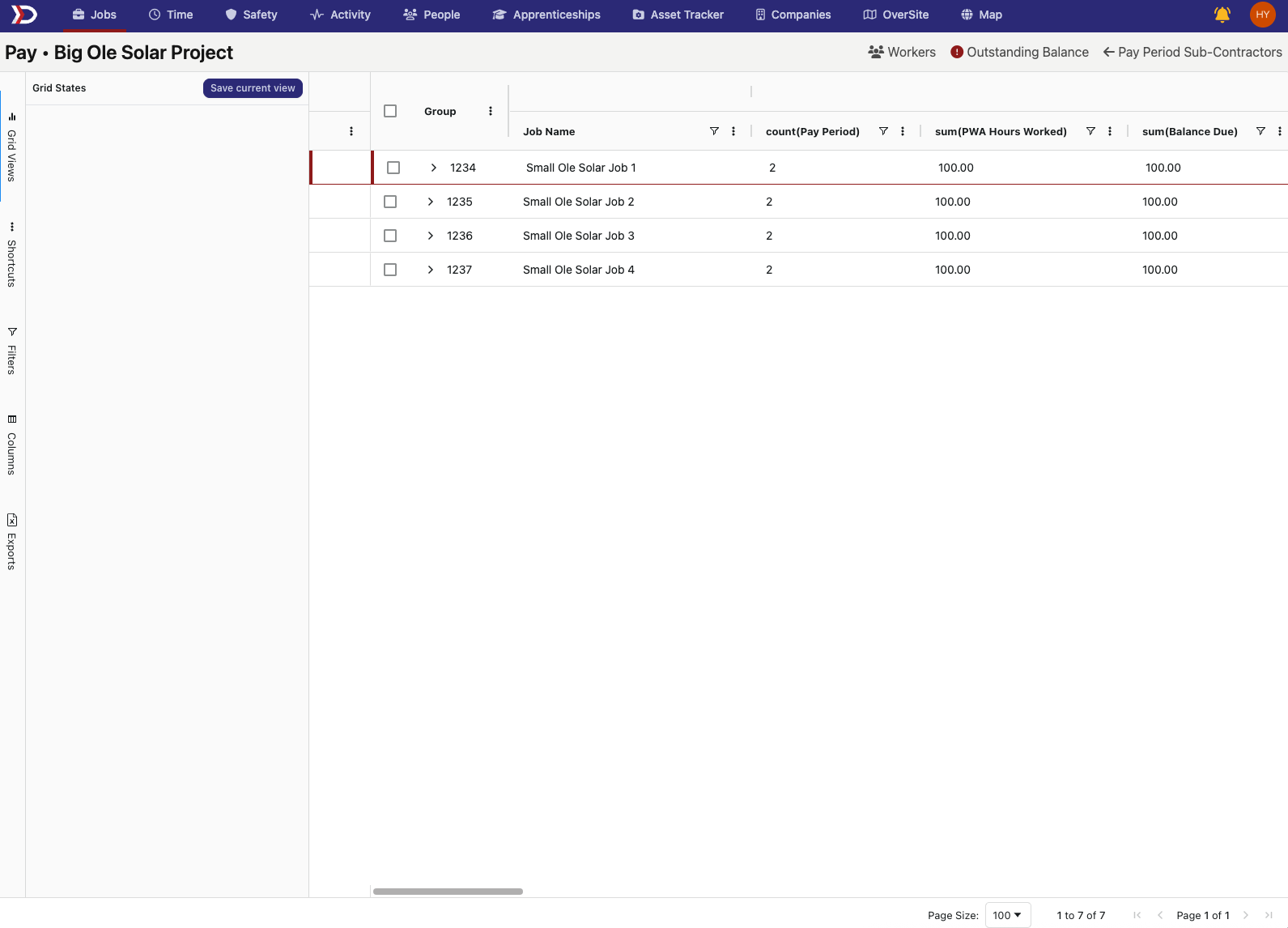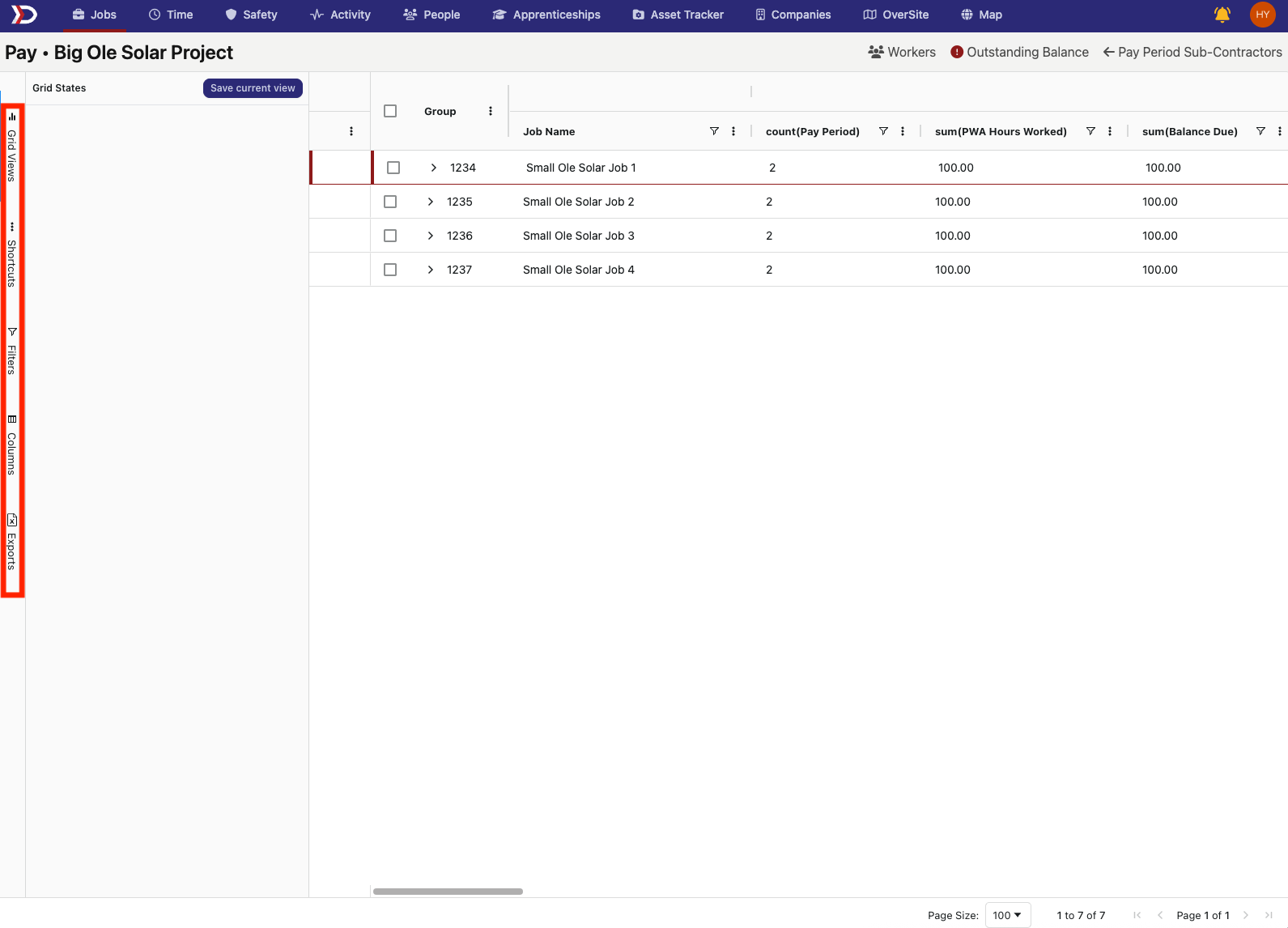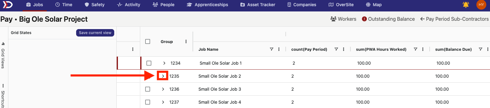 This tabular view allows for a customizable table where the pay data for every job associated with a project can be viewed and organized.