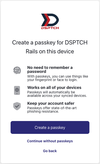 Next, optionally setup a passkey for DSPTCH. Creating a passkey is not covered in this guide. The process for creating a passkey will vary based off of the specific computer and browser being used.