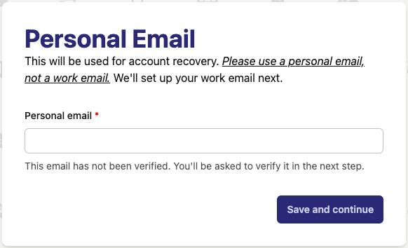 Your personal email will only be used for account recovery. Be sure to have access to it, as there will be a verification email sent.