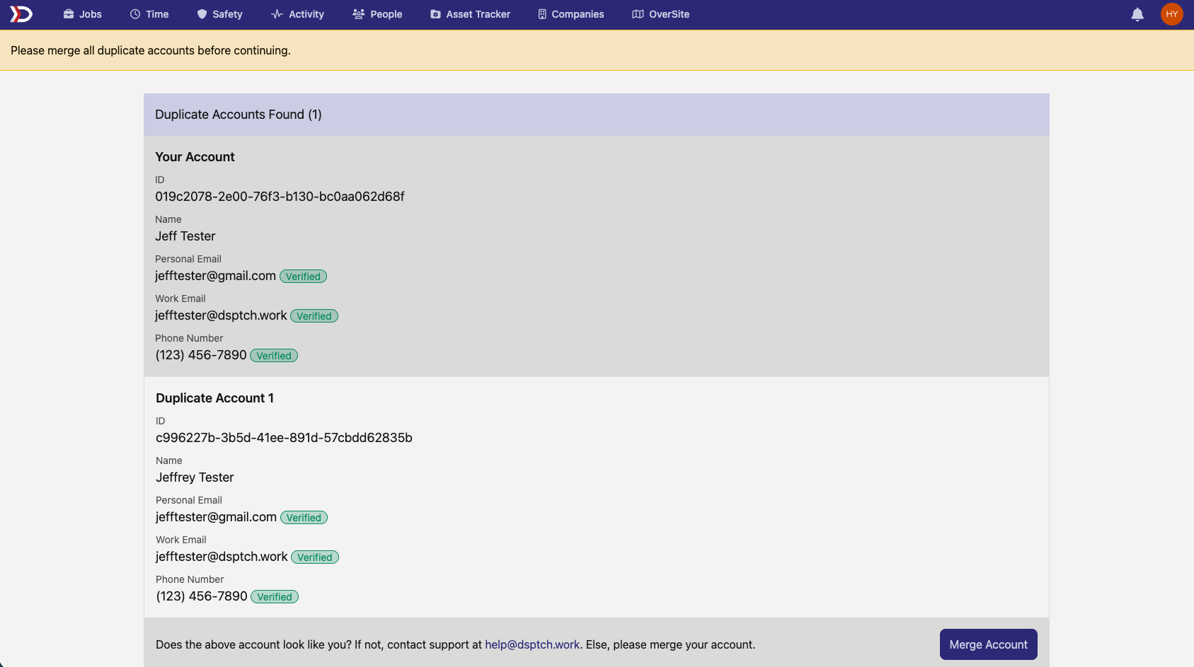 Note that the main information (such as name, email, phone #) for the account at the top labeled "Your Account" will be the kept, while the Duplicate Account will be deleted. All other information (time entries, certifications, etc.) will be combined together.