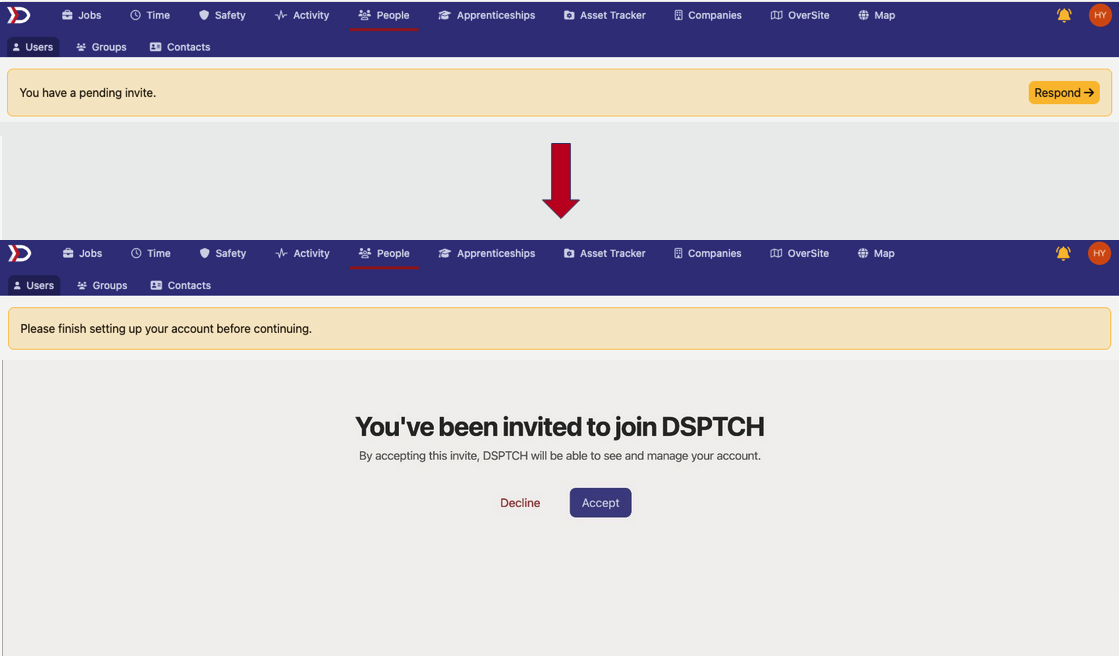 Your company may have sent an invite to grant roles and permissions within their company on DSPTCH.